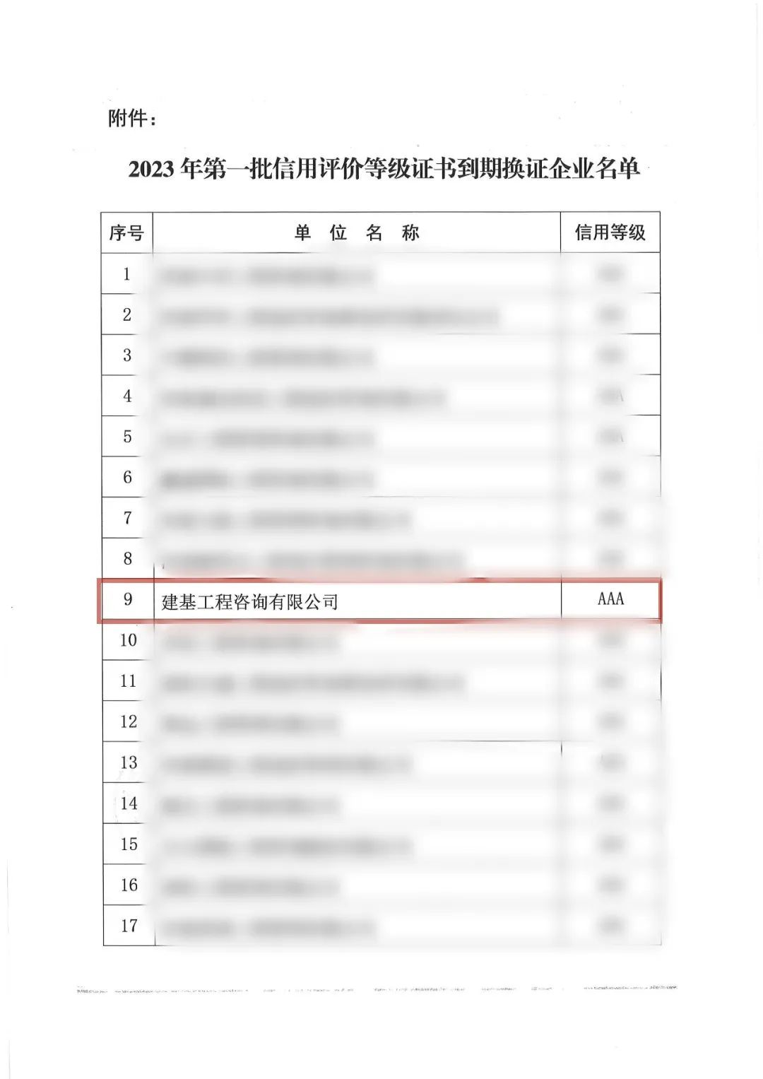 近日,河南省注冊造價(jià)工程師協(xié)會發(fā)布了《關(guān)于2023年第一批河南省工程造價(jià)咨詢企業(yè)信用評價(jià)等級證書到期換發(fā)新證的通知》。建基咨詢再次榮獲“工程造價(jià)咨詢企業(yè)AAA級”信用評價(jià)等級。